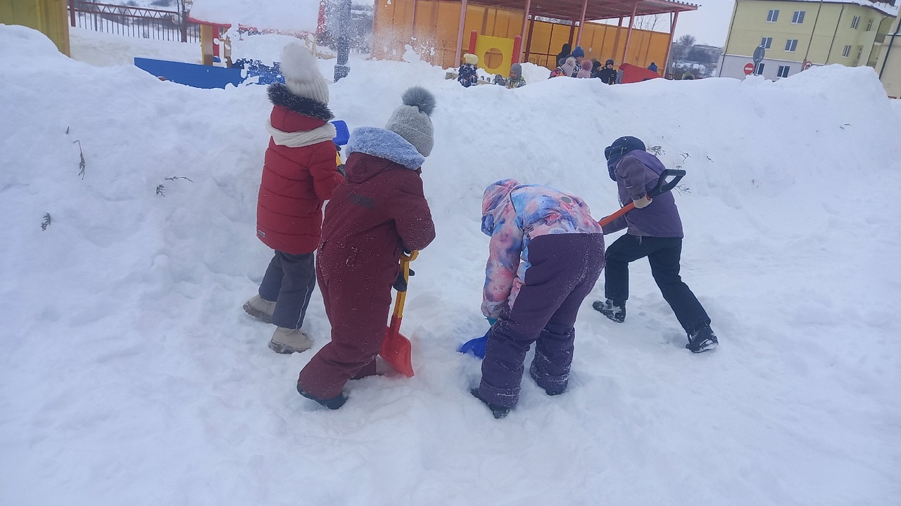 На веранде взяли лопатки и дружно принялись чистить дорожку от снега. Когда ребята возвращались с прогулки они встретились с дворником и рассказали ему о том, что расчистили дорожку. Дворник поблагодарил ребят за помощь.