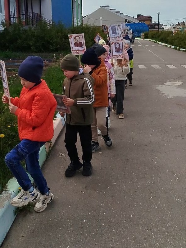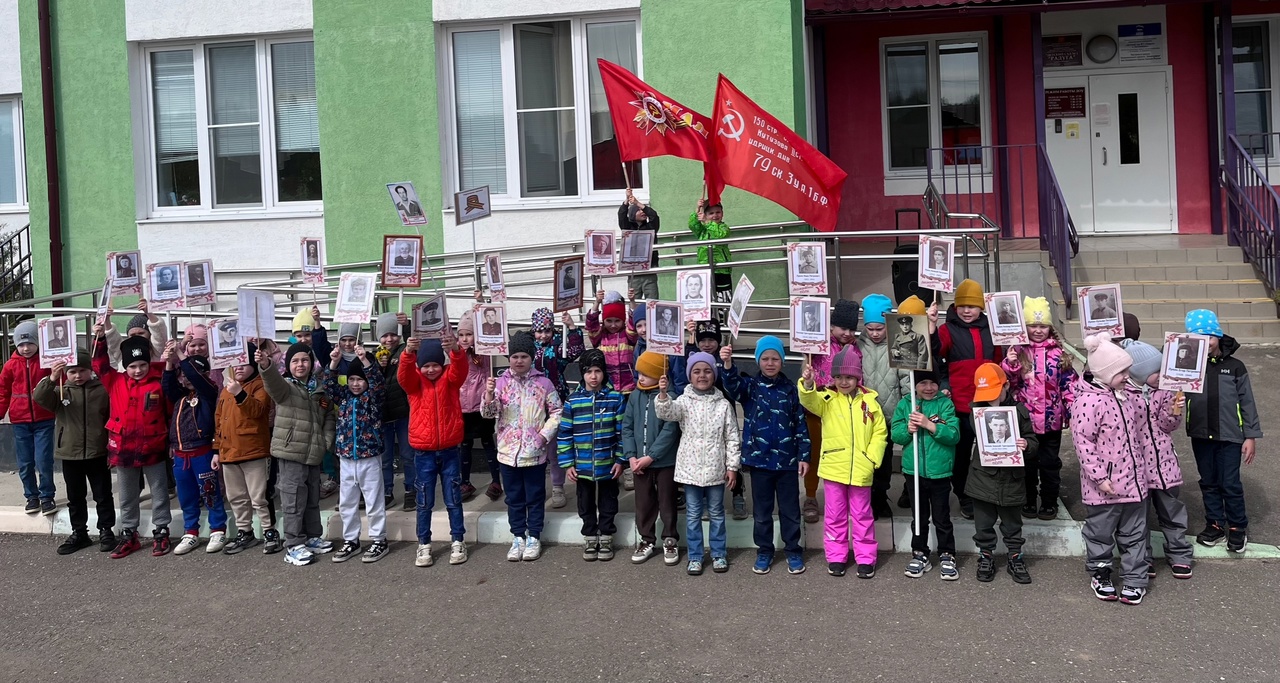 После вдохновляющей встречи с Михаилом Владимировичем, юные патриоты приняли участие в акции «Бессмертный полк». Дети с гордостью пронесли портреты героев Великой Отечественной войны вокруг детского сада, сохраняя память о подвиге наших предков.