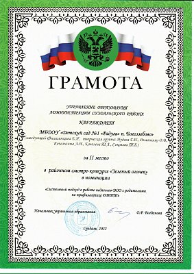 Грамота за 2 место в районном смотре - конкурсе "Зелёный огонёк" в номинации "Системный подход в работе педагогов ДОО с родителями по профилактике ДДТТ"