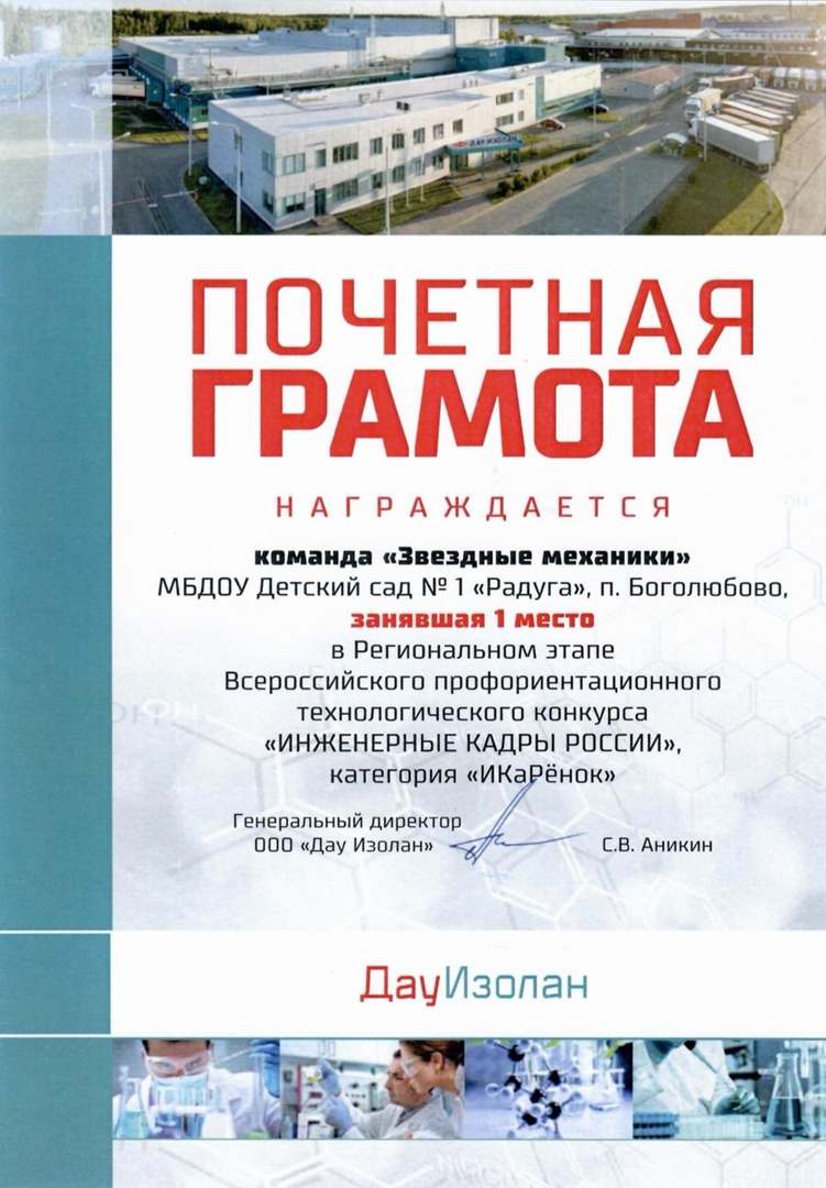 ???? 1 место - «Звездные механики» (Детский сад №1 «Радуга», п. Боголюбово): Малышев Иван, Савичев Юрий, Волотовская Ольга. Тренер - Романенко Ольга Валерьевна.